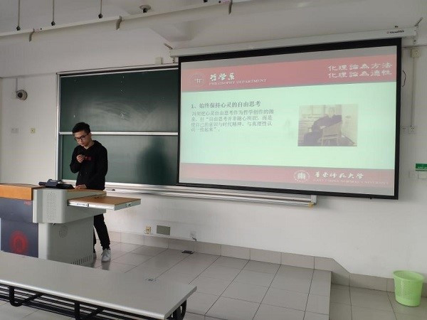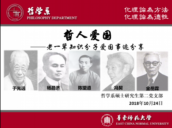 哲人爱国——老一辈知识分子爱国事迹分享 本次活动中,支部党员共分为五个小组,每一小组分别按各自专业分享本专业学术领域内的一位先辈学者在学术、教育方面的成就及其为国家建设做出的突出贡献,选取的学者分别为于光远先生、杨昌济先生、陈望道先生、冯契先生以及金岳霖先生。 于光远先生是我国著名的经济学家、革命家,科学哲学小组主要从其人生经历和治学方法两方面讲述了他从一个清华物理系的学生到积极投身革命,再到研究经济理论,为中国改革开放工作经济领域做出重要贡献的勤学一生。从自然科学到社会科学,于光远先生生动地阐释了学无止境、学有所用的治学精神。 伦理学小组选取了曾翻译《西洋伦理学史》的杨昌济先生,从其作为毛泽东的老师这一身份出发,该小组党员同志重点讲述了杨昌济先生在治学、治国、信仰等方面对毛泽东早期革命思想形成的重大影响。杨昌济先生作为一位卓有成就的教育革命家,伦理学小组的党员同志将其一生概括为“强避桃源作太古,欲栽大木柱长天”。 马克思主义哲学小组选取了为在中国传播马克思主义理念做出突出贡献的陈望道先生。陈望道先生不仅是《共产党宣言》的首版译者,同时也是共产党上海地区的发起人,他为中国革命的进程做出了巨大贡献,其在译制《共产党宣言》时把墨汁当糖的事迹为后人乐道。 外国哲学小组选取了融贯中西近代哲学家金岳霖先生,讲述了其个人的学术成就、人生志趣和家国情怀,并重点强调了金岳霖先生在抗战年代艰苦条件下完成两部重要学术巨著的光辉事迹以及他对国土完整、民族独立深深忧虑的爱国之情。
