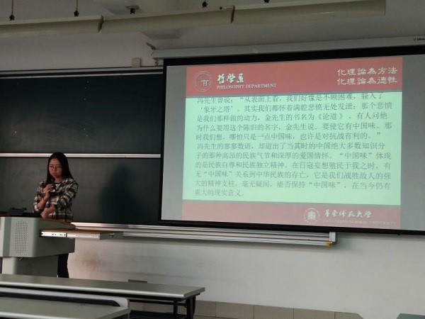 支部党员介绍先辈学者事迹 马哲和外哲联合小组着重介绍了华师大哲学系的创始人冯契先生的治学和革命事迹,结合冯契事迹展览馆的实物图,该组党员同志生动形象地展现了冯契先生积极投身革命的爱国精神、“两化”思想的学术品格和始终保持思考的爱智者本色。 活动最后,哲学系党委副书记武娟老师对本次主题党日活动进行了总结,肯定了此次活动的主题和意义,希望党员同志以老一辈学者为榜样,学习他们高尚的品格和严谨的治学态度,努力将这些文人大家的高尚品格和革命精神吸收内化,化为己有。 在分享先辈事迹的过程中,在场的每一位党员同志都被五位学者在当时所展现出的高昂的民族气节和深厚的爱国情怀深深感染。时至今日,老一辈学者所体现的民族自尊和民族独立精神在新的时代背景下依旧闪耀着光辉,值得每一位党员好好学习和体会,作为年轻一代的学生党员,我们应当传承先辈艰苦奋斗的精神,继往开来,在新的时代,创造新的功业。