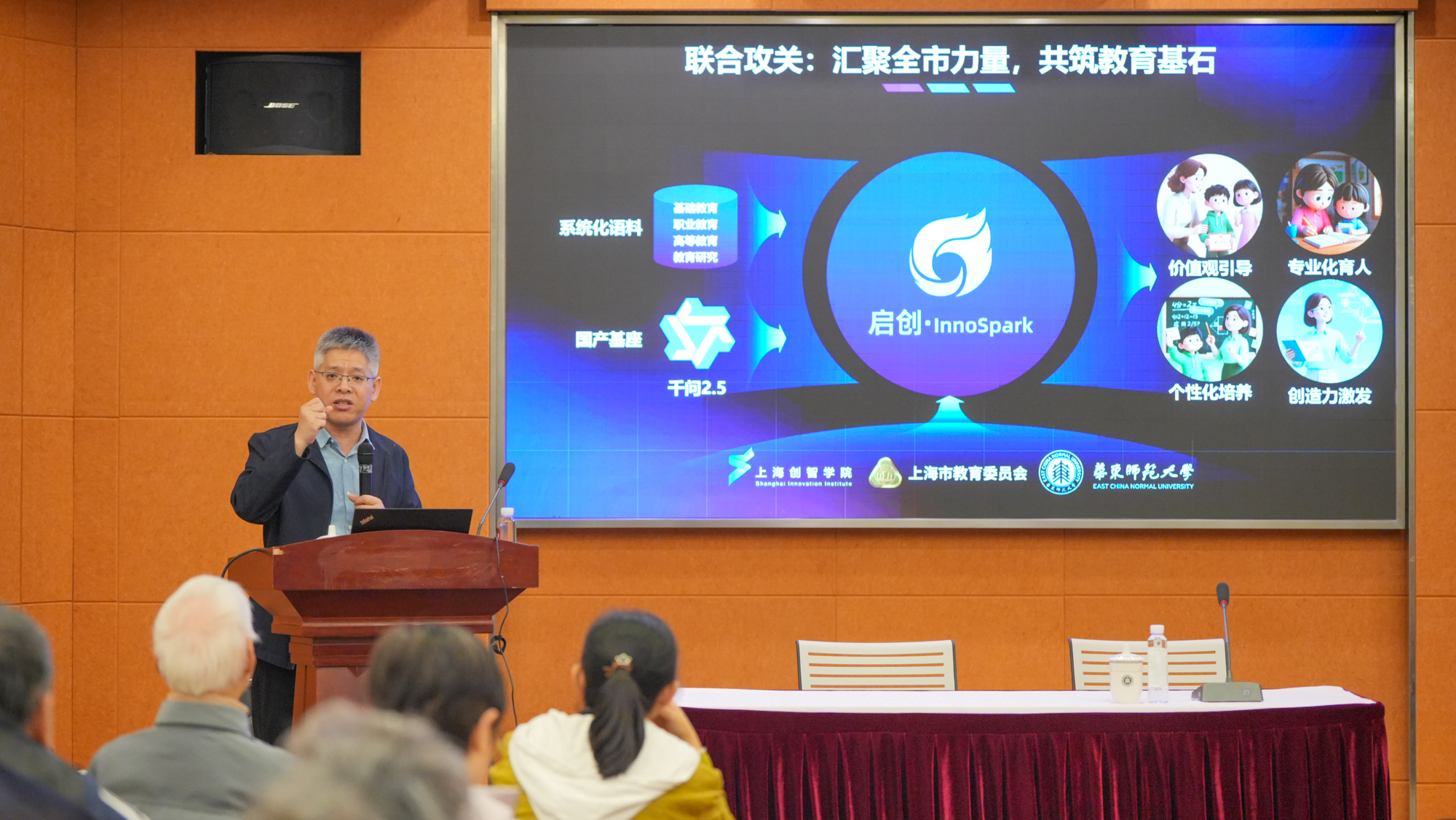 周爱民以“人工智能与教育深度融合”的全球背景为切入点,介绍了华东师大主动布局、自主研发教育大模型“启创・InnoSpark”的全过程,并详细讲解该模型的研发进展与赋能教育的实践成果。他通过具体案例,生动展示了教育大模型在课堂教学、自主学习、作文批阅、创造力测评、东巴文智能翻译等场景的应用,既让大家直观感受到人工智能对教育的深刻变革,也充分彰显了华东师大依托教育学、心理学等优势学科开展人工智能研究的实力与底气。