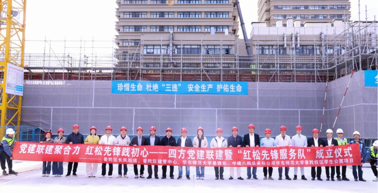 2025年10月22日,华东师范大学基建处党支部在普陀校区新建学生公寓工程项目现场举行普陀校区学生公寓项目党建联建暨“红松先锋服务队”成立仪式。基建处党支部、长风新村街道党工委、普陀区建筑业管理中心第二党支部、中国建筑第八工程局有限公司总承包公司第三分公司党总支党员代表参加活动。