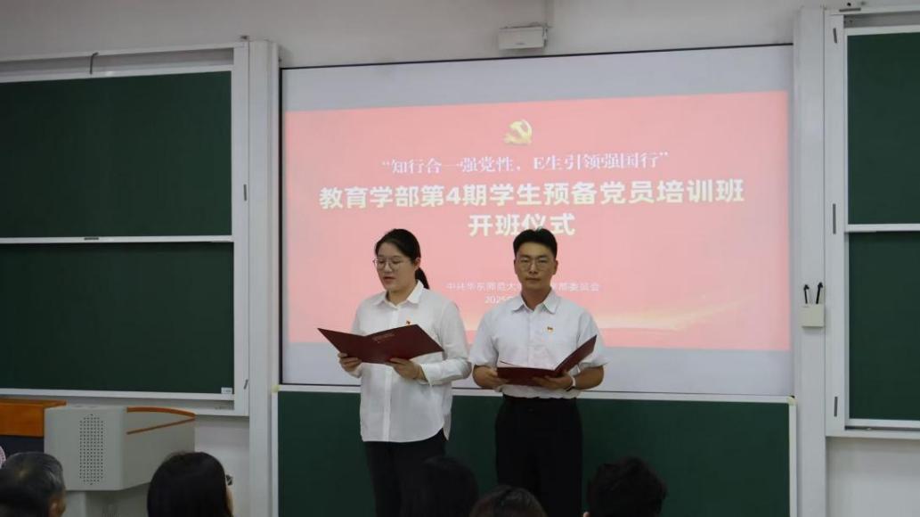 2025年10月29日,华东师范大学教育学部党委第四期学生预备党员培训班开班仪式在普陀校区文附楼503室举行。教育学部党委书记闫露,教育学部关工委副主任张志杰,教育学部特邀党建组织员梅剑,教育学部党委专职组织员司桂霞,教育学部学生党建中心指导教师胡航等参加活动。课程与教学系2025级硕士生王锦荣、学前教育学系2023级本科生杨珊珊主持仪式。