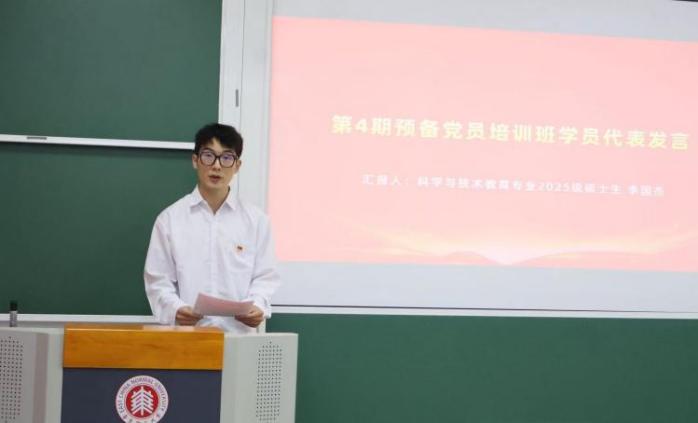 科学与技术教育专业2025级硕士生李国杰代表本期培训班学员发言,他说:“我们应在时代变革中彰显专业担当,在实践淬炼中践行入党初心,将入党誓词转化为服务人民的具体行动,用青春和智慧书写属于自己的精彩答卷。”