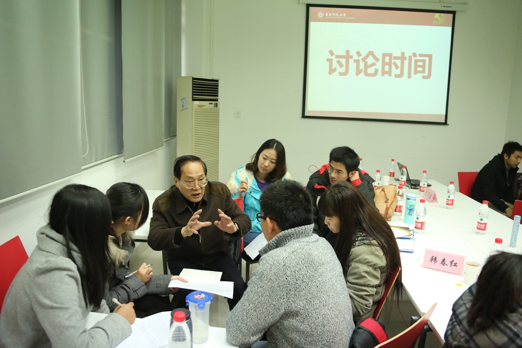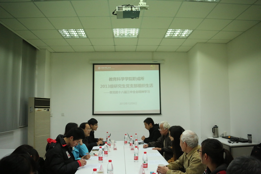 为深入学习党的十八届三中全会精神,12月6日1,教科院关工委钱景舫、范杰、王德纪、曹揆申四位老师与职成所2013级研究生党支部党员们在文科大楼102教室学习十八届三中全会精神。教育科学学院党委副书记、副院长韩春红老师,团委书记范竹君老师,职成所辅导员孙梦老师也参加了本次学习。职成所2013级研究生党支部书记王宇驰主持活动。