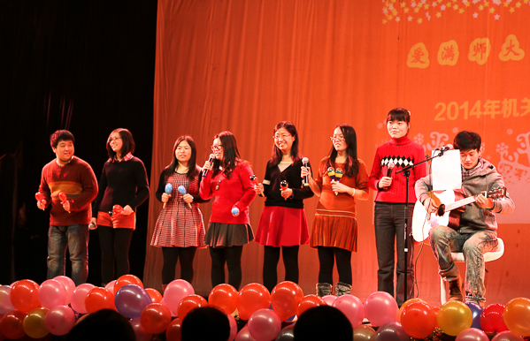 合作交流办:独唱《海恋》 联欢会上,科技处、社科处、学科办带来的健美操表演《青春魅力》充满青春活力,信息办自编自唱的歌曲串烧展示了部门特色,纪委、组织部、宣传部、统战部、机关党工委、信访办、审计处等七部门的歌伴舞《天路》将活动推向了一个高潮,校老年艺术团的时装表演则显示了退休女老师们的风采。国际教育中心、合作交流办、研究生院、财务处和人事处等部门也纷纷上演了精彩节目。教务处的“三句半”《银蛇迎骏马》、学校办公室的歌曲联唱《追梦人》、上海纽约大学的脱口秀、国际交流处的配乐诗朗诵《我的祖国》等赢得了大家的阵阵掌声。