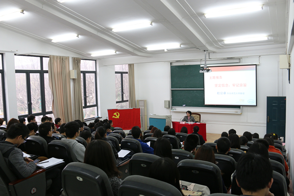 简短的开班仪式之后,杜公卓教授做了题为“坚定信念,牢记宗旨”的主题报告。报告主要围绕入党申请、入党条件、理想信念、如何争取入党等几个内容展开,结合当下时事热点、具体实例以及当前党建理论研究,深入浅出地向各位学员介绍了作为一名共产党员应该具备的素质和条件。杜教授指出,申请入党,就必须信任和拥护我们党,但强调不是盲目信任,而是基于对党的方针、路线、理论的学习,做到从心里认同党的知识和理论。杜公卓进一步指出,坚定的理想信念是作为一名中国共产党员的基础。作为一名大学生入党积极分子,要加入党组织,除了信任中国共产党、有坚定的共产主义信念以外,还应该不断提升个人的各方面品质和素养、主动服务同学、加强专业学习,真正从思想上、行动上都做到积极向党组织靠拢。