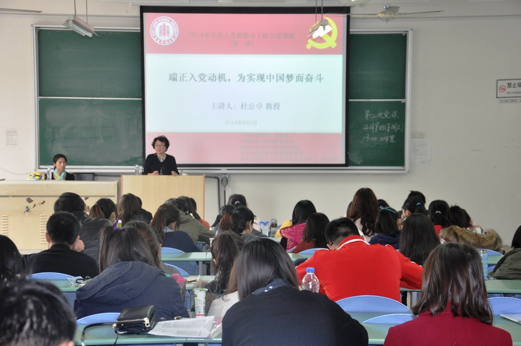 4月2日下午,来自学前教育与特殊教育学院、对外汉语学院、国际关系与地区发展研究院、化学系、科学与技术跨学科高等研究院、精密光谱科学与技术国家重点实验室等六个院系的同学们迎来了2014年学生联合党校的开班仪式暨第一堂党课。为此次学生联合党校带来第一讲的是学生党建工作资深专家杜公卓老师,名为“端正入党动机,为实现中国梦而奋斗”的主题报告从学生入党的根本切入,带给新时代背景下的青年们更多的思考与感悟。