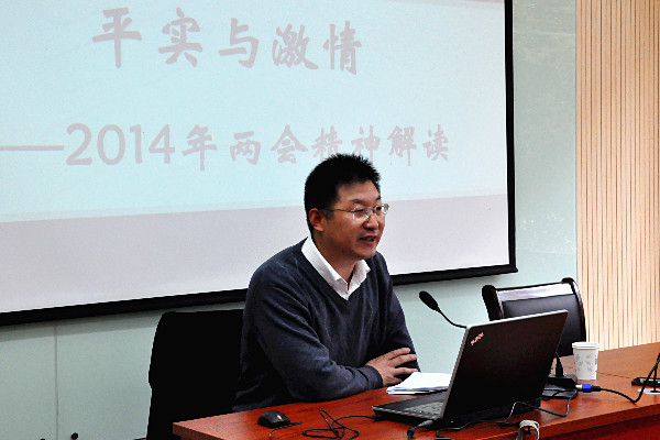 章义和教授解读两会精神 章义和以自身参加两会的亲身经历向党员们描述了此次全国两会的整体氛围是朴实中渗透着积极献言献计的激情。他表示,自己在参加两会前,带着如何推动改革、如何保持民营企业元气、如何避免公务员消极怠工、如何治理雾霾等几大期待赴会。 随后,章义和总结了一些与会期间的关注点。首先谈到了各代表团积极热议的何为改革“硬骨头”。他认为,利益固化和路径依赖是改革路上的两大“障碍石”;其次,对于“三公”经费的问题,预算编制的审查和执行是解决问题的关键点;最后,他特别提到了习近平总书记在两会中每天下代表团,尤其是在“3.1昆明恐怖暴力事件”发生后到少数民族组的讲话具有安抚作用,引导了正确的舆论方向。 章义和对其最关心的教育问题作了深刻的阐述。从教育改革、高校去行政化、考试制度改革、教育公平、教育观念与经费、民办与职业教育、留守儿童等十个方面进行了深入浅出的分析。他认为,高校要去官僚化,必须处理好政府与大学的关系,设置大学章程可以解决大学趋同性问题。对于教育改革,他指出教育应该多出口,公办与民办教育体系平行是最理想的模式,此次两会特别提到了要大力发展职业教育,这可以说是本次两会的一大亮点。 章义和以幽默风趣的语言,敏锐的政治嗅觉,使党员同志们了解到此次两会的亮点和会议基调,受益匪浅。最后,章义和还鼓励党员同学多积累知识,培养观察问题的能力,努力发挥自己的才能,为国家改革建设献言献策。