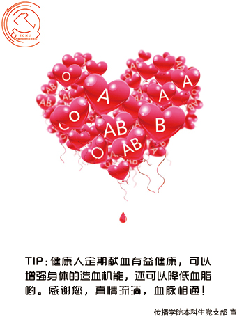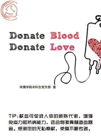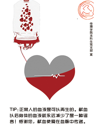 5月26至30日,是我校2014年学生献血周。传播学院本科生党支部利用专业特长,设计了以传播学院为主同时面向全校的献血宣传及志愿者服务系列活动。此次活动的主题是“创‘心’传播,热‘血’公益”。