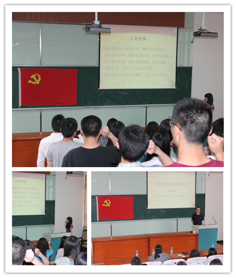 聆听了李老师的殷切希望之后,在上海市优秀毕业生、本科2010级3、4班党支部书记程馨慧的领誓下,全体毕业生党员共同回顾了入党誓词,面对党旗庄严宣誓。随后, 2011级硕士研究生党支部书记屠珺楠代表毕业生党员向党组织表达了不忘组织培养恩情、不忘对党忠诚的决心。