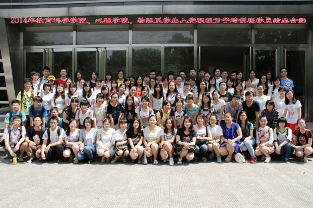 125名学员顺利通过考核,获得结业证书 在同学们热烈的掌声中,2014年教育科学学院、心理与认知科学学院、物理学系学生入党积极分子培训班圆满结束,党校全体学员在文科大楼前合影留念。