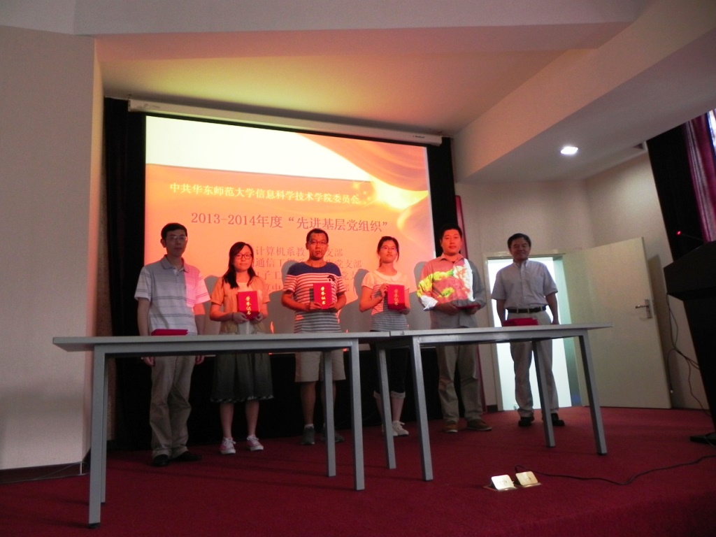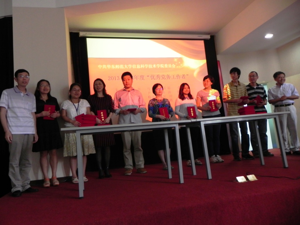 为弘扬正气、表彰先进、总结典型经验,在中国共产党建党93周年到来之际,信息科学技术学院在信息楼147召开“七一”表彰会。信息学院党政领导及全体党员参加了会议。 会上,信息科学技术学院副院长杨平雄宣读了《中共华东师范大学信息科学技术学院委员会关于表彰“优秀共产党员”、“优秀党务工作者”、“先进基层党组织”的决定》,授予李建芳等24名同志信息学院“优秀共产党员”荣誉称号;授予朱敏等20名同志信息学院“优秀党务工作者”荣誉称号;授予计算机系教工党支部等5个党支部信息学院“先进基层党组织”荣誉称号。同时鼓励受表彰的支部、个人珍惜荣誉、戒骄戒躁、再创辉煌,同时号召全院党支部、党员、党务工作者向受表彰的支部和优秀个人学习,为实现全院新的发展做出更大的贡献。“优秀共产党员”获奖代表陈雪皎和阮静分别代表教师和学生发言,表示将在自己的工作岗位上勤奋务实、服务他人,做出新的更大的贡献。