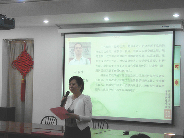唐莲英教授做《筑牢党的建设的防线》专题报告 随后进入集体交流阶段,学院团委书记俞虹主持了相关系列活动。 首先是“党员集体政治生日”。学院党委特地为今年逢入党五、十周年乃至四十周年的18位教师共度温馨的“集体政治生日”。院党委委员为大家赠送了书籍作为纪念品,过“生日”的党员逐一发表感言,“10岁”的蒋冰冰说:“入党是对信仰的追求,追求永无止境;入党是对自我的鞭策,鞭策始终如一。”对鞭策的理解,“40岁”的顾伟列认为:“作为在大别山革命根据地宣誓入党的老党员,当时刻以爱生以德,报国以忠,教书育人,身正务实为践行宗旨之鞭策。”学院自聘教师尚亚楠充满感情地表达:“蓦然回首,十载春秋逝。恰少年时,难忘党旗下举拳宣誓。拾过去记忆,只为那份爱与敬的期冀。今生,永不悔青春属这三尺讲台之地。”已经退休的老党员史舒薇依然执着地说:“党员要能吃苦、吃亏、吃批评。”年轻的党员徐艾妮、徐燕婷希望在建设服务型党组织中发挥作用:因为“党员出于群众,却在不经意间更多了一分对家国大小事的关注。”这样,“10年、20年、30年后依然能够骄傲自豪地说‘我是一名合格的共产党员’!” 在过去的几年中,国际汉语教师韩冰、王超、邱洪艳等都经历了从学生到教师的角色转变,但是他们纷纷坦言,对党的感情和信念,始终未变。 其次是“先进表彰”。院党委副书记、副院长王郦玉宣读了《关于表彰对外汉语学院优秀共产党员、优秀党支部书记、先进党支部的决定》,张建民、刘承峰获“优秀共产党员”称号,汉语文化教学中心党支部书记包文英获“优秀党支部书记”称号,院部管理教工党支部荣获“先进党支部”。党委书记黄薇、院长吴勇毅代表学院党委为获奖的集体代表和个人颁发了荣誉证书,获奖教师纷纷表示要继续努力、积极进取,为汉语国际教育事业的繁荣做出更大的贡献。 再次,学院党委向全体党员报告了 2014年学院基层党建工作的三个校级创新立项的基本情况,即学院党委2014年“特色党建工作实践项目:“桃李有言 薪火相传——以党建促学生思想政治素质发展”、院部管理党支部“创新组织生活实例”项目:“从‘三找’到‘三招’——以党建促服务”、汉语言系教工党支部“创新组织生活实例”项目:“弘扬汉字文化——汉语言系党员教师提升留学生的汉字书写能力”。还介绍了2014年校园文化建设中学院获得资助的两个校级立项:“汉语国际教育口述史”研究和“师生读书共同体”的建设。汉语言系党支部书记肖路作为代表汇报了有关情况, 她提出:教书育人是教师的天职,更是党员教师的使命,因此倡议本支部和全院党员教师共同加入到该活动中,用好立项的资源条件和平台,努力营造全院良好的读书文化氛围,用所学所思指导和引领学生,携手推进学院党建工作。