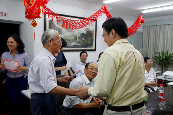 老干部代表为获奖院系和个人颁奖 会上,大家观看了反映我校老同志过去一年来精彩活动的《步履蹒跚紧追梦》,以及我校党委落实《上海老干部工作领导责任制的实施意见》情况的影像资料,表彰了教育科学学院等12个先进集体和刘晓鸣等5位先进个人。老干部代表刘宗章、鲍修德同志为获奖院系和个人颁奖。 会议还对二级管理工作部门开展第27个敬老节有关活动进行了布置。