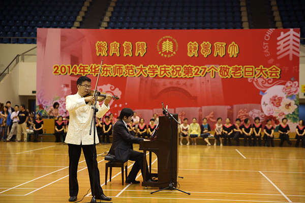 9月24日下午,华东师范大学第27个敬老日庆祝大会在中北校区体育馆举行。为弘扬敬老美德,欢度重阳佳节。在音乐学系党委的号召下,师生党员发挥自身优势参与庆祝活动。