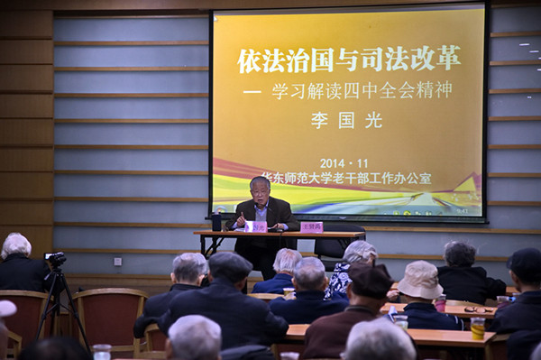 李国光应邀来校作“依法治国与司法改革”报告 在长达近两小时的报告中,李国光首先向老同志解读了四中全会报告的基本内容和主要精神,阐述了四中全会对全面推进依法治国,建设法治中国所产生的重大现实意义和深远历史意义。随后,李国光以其几十年丰富的工作实践和专业理论知识,配以一个个生动的案例,就有关司法改革问题,向老同志们一一讲解了四中全会决定的有关制度和措施。他以自己的学习体会,对如何学习四中全会的有关精神提出了若干意见和想法。