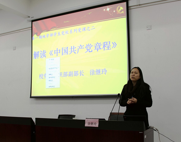 12月17日,地学部党校特邀校党委组织部副部长徐继玲为学部入党积极分子授课,解读《中国共产党章程》,并阐释我校党建工作情况。