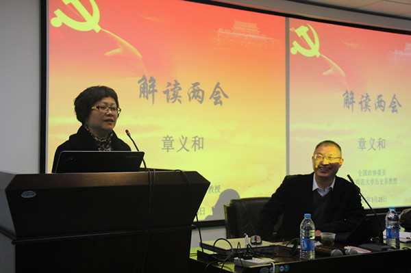 章义和教授首先对全国“两会”的基本情况做了详细介绍,就政府工作报告进行了深入解读,并对本次政府工作报告的突出特点进行了分析。他表示今年的政府工作报告贴近生活、语言生动、内容详实,从务实、简明的报告以及政府的作为中看出政府正简政放权。随后,他从“四个全面”的战略布局谈起,就习总书记“政治生态也要山清水秀”介绍了他在北京参加两会期间小组讨论委员们踊跃发言、交流的情况,并就两会中关注度较高的教育问题与在座师生进行了深入探讨。