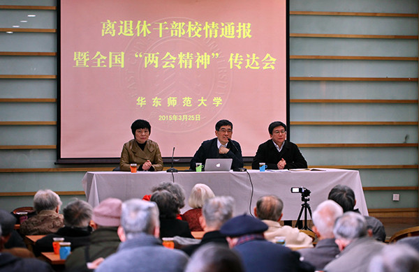 3月25日上午,离退休干部校情通报会暨全国两会精神传达会在校工会多功能厅举行。校党委书记童世骏、校长陈群、党委副书记杨昌利出席会议并作校情通报,杨昌利主持会议。离退休干部、老教授协会等八十余人参加了报告会。 会上,童世骏向老同志们通报了今年学校党委的重点工作。结合《关于坚持和完善普通高等学校党委领导下的校长负责制的实施意见》和《关于进一步加强和改进新形势下高校宣传思想工作的意见》的主要精神,童世骏指出今年我校将进一步坚持、完善和落实党委领导下的校长负责制,加强宣传思想政治工作,抓好反腐倡廉、基层党建和干部队伍建设。