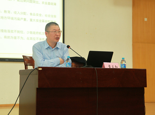 开班典礼之后,全国政协委员、我校历史系教授章义和应邀作首场讲座,传达“两会”精神。他以“平年两会不平常”入手,介绍了今年两会的基本情况、政府工作报告的主要内容和两会热点,并着重就“协商民主在社会主义民主制度建设中的重要发展”、“2014年政协工作亮点‘双周协商座谈会’的主要内容和作用”、政府工作报告及“四个全面”等两会焦点话题进行深度解读。