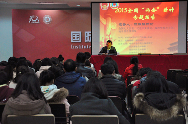 4月8日下午,对外汉语学院党委携手设计学院党委召开了“两会”精神专题报告会,全国人大代表、我校教授陈振楼应邀为师生解读全国“两会”精神。对外汉语学院、国际汉语教师研修基地、设计学院全体教职工及部分学生党员代表聆听了本次报告,报告会由对外汉语学院党委书记黄薇主持。