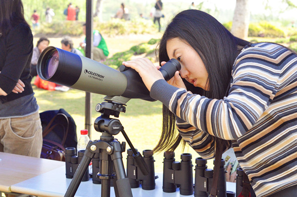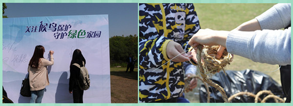 主办方为公众提供观察设备 在本次公益活动中,社会发展学院师生党支部的志愿者们以“环保骑单车”的方式统一前往活动现场,并在留言板上签名,写下寄语,号召大家关注候鸟保护,守护绿色家园。在主题为“我为鸟儿筑新巢”的子活动中,亲自动手为鸟儿编制稻草窝,并认真学习了关于野生动物保护的知识。