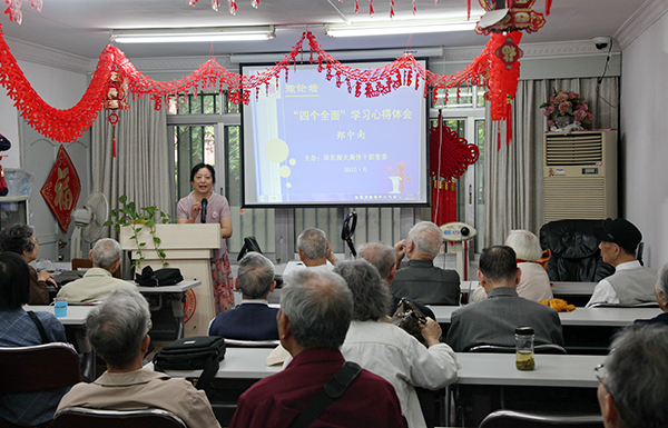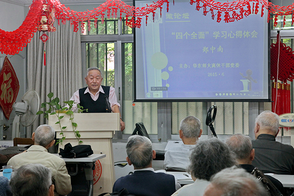 6月5日上午,我校离休干部党委在老干部活动室举办第三届微论坛,离休干部党委副书记郑中南就学习理解“四个全面”与大家交流了心得体会。微论坛由离休干部党委书记朱月琴主持,三十余位老同志与会。