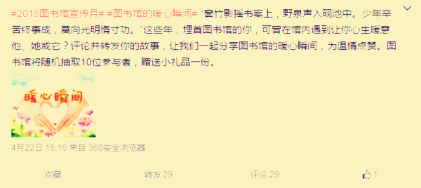 组织“图书馆的暖心瞬间”微博话题征集活动 为了了解学生对图书馆的感受,支部党员创意了通过微博征集“图书馆的暖心瞬间”的活动,征集到的小故事成为学生们认知和感受图书馆的另一渠道,也是图书馆员工了解读者改进服务的良好途径。