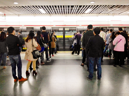 文明:人群涌入站台后,自觉在屏蔽门两侧排成纵队,耐心等待列车到来。