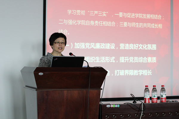 优秀党务工作者孟博作主题发言 优秀共产党员、2013级硕士生马顺心同学结合自身经历,分享了作为动物学研究生党支部书记,在策划和组织创新组织生活如生物博物馆参观、垃圾旧物回收等一系列支部活动中的感悟与成长。 大会的第二项议程为“三严三实”专题教育党课暨动员部署会,院党委书记房建军传达了我校关于开展“三严三实”专题教育的精神和要求,并主讲了题为《认真学习,深入践行,结合“严实”要求,推动学院发展》的党课。房建军首先立足于党风建设较为深入地剖析了习近平总书记提出的“三严三实”丰富内涵和重大意义并结合我校落实“三严三实”专题教育的理念和要求,分享了学习童世骏书记党课的心得感悟,最后,联系学院实际,回顾了学院党委近年来在思想建设、作风建设等方面的经验与成绩,并对未来把“三严三实”相关要求更好地融会贯通到实际工作中提出了新的要求,希望广大党员师生真正从思想上、工作上、作风上严起来、实起来。提高做人、做事的素养,勇于负责、勇于担当,共同打造生命科学学院的文化,切实为学校、学院的发展贡献力量。