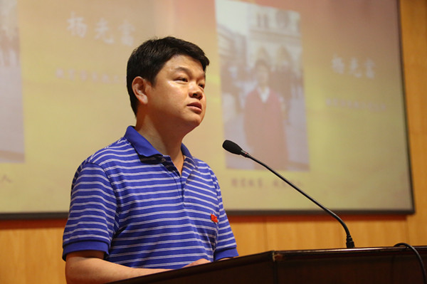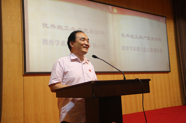 教育学部“优秀共产党员”获得者杨小微教授发表获奖感言 教育学部“优秀党务工作者”获得者、教育学系教工党支部副书记杨光富在介绍党务工作经验时介绍了教育学系“薪火传承”、“一支部一特色”等品牌活动特色,传达了“在工作中敢于担当”的信念。