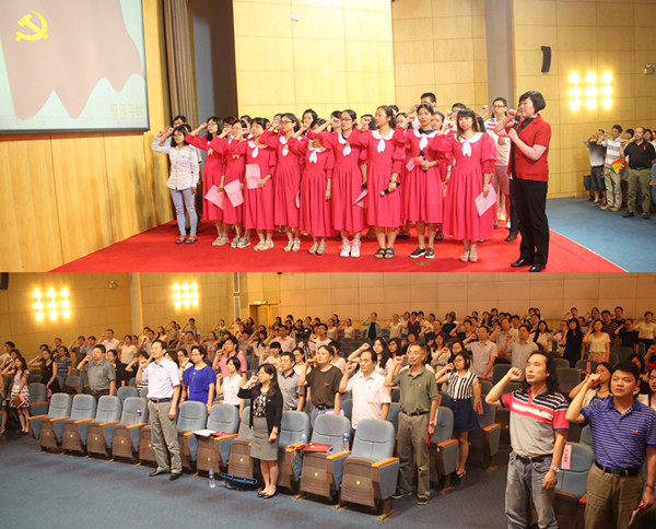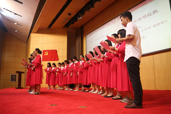 艺教、高职联合教工支部蒋新俭老师独唱《祖国,慈祥的母亲》 大会最后,在学部党委书记汪海萍的带领下,全体师生党员面向党旗,集体重温入党誓言。铮铮誓言在整个会场回响,教育学部党员们在《歌唱祖国》的歌声中,唱出了重振起航的蓬勃朝气。