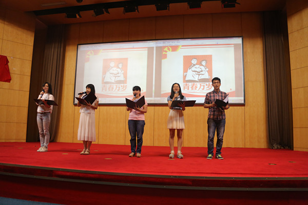 教育学系2013级硕士研究生党支部朗诵《什么是青年》 随后,在毕业生党员代表离校赠言中,“优秀学生党员”获得者、言听-艺教-学专联合学生党支部的毕业生党员张龙佳黛,结合自己的毕业经历,以“勇敢”、“责任心”、“勇于不敢”诠释了党员需要具备的三个品质,并向全体毕业生党员发出捍卫信仰、践行责任、勇敢前行的呼吁。来自学部的21名毕业生党员代表采取红歌联唱《没有共产党就没有新中国》、《让我们荡起双桨》的形式,庆祝党的生日,用歌声颂出对党的热爱。艺教、高职联合教工支部蒋新俭老师同时带来了专业演唱《祖国,慈祥的母亲》,将大会气氛推向高潮。