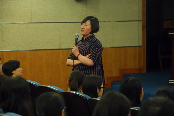新生党员代表李娟娟发言 热烈的分享交流环节后,教育学部党委副书记韩春红带领全体新生党员集体重温入党誓言。铮铮誓言回荡在会场中,气氛严肃而庄重。 教育学部党委书记汪海萍在最后的总结讲话中表示,作为学生党员,应当勇于承担更多的责任,积极参加组织生活,加强对党的认识。同时指出,每一位党员都应该思考如何在一生中践行党的纲领,告诫新生党员要做一个道德高尚、有尊严、有格局的人,也应该成为可爱、可敬、可亲的人,这样才能更好地发挥党员先锋模范作用。