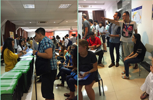 9月4日-7日迎新日,对外汉语院2014级研究生党支部和国际教育中心党支部“牵手”共迎2015级留学生。为确保迎新活动顺利开展,双方支部于上学期末规划好迎新志愿活动计划,在开学前亦及时沟通、敲定细节,确保党员志愿服务活动有序开展。 迎新当日,党员们及早到达布置场地,树引导标语、布置桌椅。从校门口引导到物理楼大厅咨询,再到大厅内注册主会场,每个岗位上都活跃着党员们的身影。在留学生报到的高峰期,师生党员们稳妥应对,有序引导,以热忱的微笑、真诚的服务、巧妙的沟通化解语言障碍,赢得了留学生们的认可,展现了师大“新家庭”的温暖。在双方支部党员们共同努力下,迎新活动圆满结束。本次迎新活动以支部牵手共建的形式开展,增进了支部间凝聚力,以志愿服务的形式展现了党员风采,深化了服务型党组织建设。