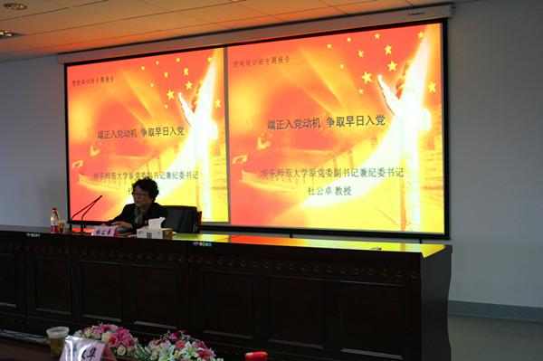 11月18日下午,生科院第十五期党校开班典礼暨专题讲座“端正入党动机,争取早日入党”在生命科学学院534室举行。华东师范大学原校党委副书记兼纪委书记杜公卓教授应邀作了开班专题讲座,50名党校学员参加了本次活动。活动由学院党委副书记兼副院长徐敏华主持。