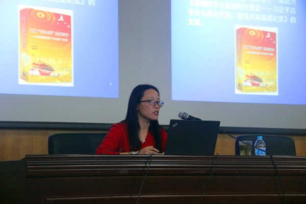 学院党委书记李恺主持报告会 杜玉华老师在报告中首先解释了“四个全面”的文字表述并给出了几个问题:“四个全面是全新的吗”、“四个全面的内容是全面的吗”、“四个全面是理论新飞跃吗”、“四个全面与中国梦和习近平系列重要讲话是什么关系”、“四个全面和五大发展理念是什么逻辑关系”。随后,围绕上述问题对中央治国理政新理念进行深入解读。在介绍“四个全面”提出背景时,杜玉华强调了当前可能会面临的三个陷阱“中等收入陷阱”、“修昔底德陷阱”和“诺西托陷阱”,并以历史案例生动解读了这几个陷阱的危险所在,还阐述了当前我国社会发展中存在的一系列问题。最后,指出要跨越这几个陷阱和解决当前发展瓶颈,必须要以全面深化改革为动力,以全面依法治国为保障,以全面从严治党为控制,最终实现全面建成小康社会。