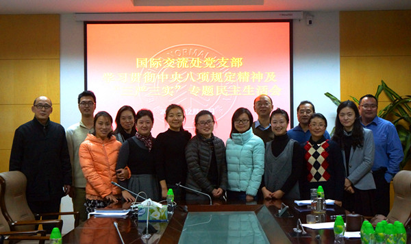 支部党员深入学习中央“八项规定”精神 同日下午,国际交流处支部还举行了“三严三实”专题组织生活会。会上全体党员观看了“上海市委书记韩正对下一阶段全市开展‘三严三实’专题教育提出要求”的新闻视频,并集中学习中共中央政治局常委、中央书记处书记刘云山关于“三严三实”专题教育工作的讲话稿,深刻学习领会习近平总书记关于践行“三严三实”的新思想新要求。支部书记孙一同时向与会党员传达了校党委关于开展“三严三实”专题教育的指导思想并组织了讨论。随后,每位党员对照“三严三实”的标准,认真开展了党员自评和互评活动,通过回顾和总结、相互提醒和建议,党员们进一步统一了思想、认清了形势,牢固树立“外事无小事”的观念,从严从实做好我校的外事工作,不断提升外事工作的管理水平和服务质量。