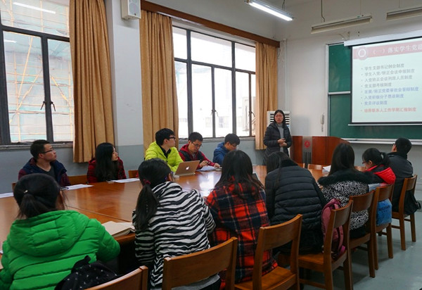 陈媛回顾学部2015年度学生党建工作 会上,陈媛老师首先从三个方面对学部2015年度学生党建工作进行回顾,从工作重点和亮点出发,介绍了学部学生党建制度的落实和创新,以分类教育为原则开展的组织工作及学生党建活动,以及学生党建工作的获奖情况。其中,对于预备党员入党宣誓、党员教育讲座、党建沙龙等品牌活动的质量提升,学部党校、入党积极分子恳谈会、培养联系人交流会、新老生党员特色教育活动的巩固创新进行了重点总结。 在学部层面总结的基础上,各学生党支部书记进行年度工作汇报,就一年来的支部生活的开展情况和特点展开总结,并指出自身工作中存在的不足及困惑,如对党的理论学习不够系统,毕业生支部民主生活会时间难以统一等问题,也对学部的党建活动、组织工作等提出了一些建议。期间,韩春红老师和孟永红老师耐心细致地对在场支书提出的问题进行了解答。