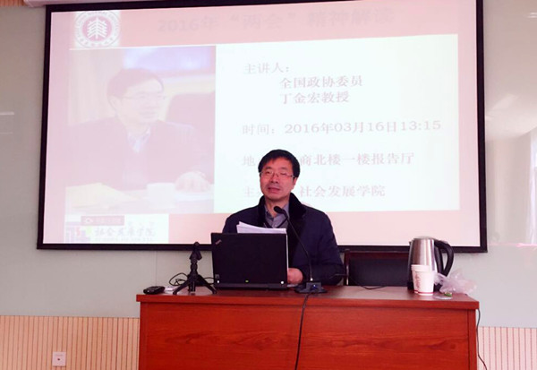 3月16日下午,社会发展学院党委邀请全国政协委员丁金宏教授在法商北楼一楼报告厅为学院师生党员解读2016年“两会”精神。讲座由院党委副书记黄燕老师主持。 丁金宏教授首先向大家介绍自己作为政协委员在两会期间和休会期间的履职情况,并分享了在两会期间和2015年前往西南部调研时的所思所想。之后,丁教授对政府工作报告进行了详细解读。强调了2015年是中国在困难中坚定前行的一年,在“三去一降一补”的情况下国民生产总值依旧可以保持近7%的增长,这实属不易。这表明中国的经济发展还是很有希望的,但也不能松懈。在谈到“十三五规划”时,丁教授表示扩大内需的有利途径是推进新型城镇化建设,社会发展学院的“城市社会学研究”在这方面可以大有作为。 最后,丁教授介绍了部分委员在全国政协会议上的主题发言,并讲述了自己的感受。指出今年政协会议三场主题发言分别是“经济建设与环境保障”、“文化建设与社会发展”和“统一战线”,委员们的发言精彩且切合实际、建议深刻很受认可。