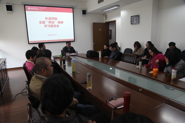 外语学院党委书记俞黎阳主持报告会 会上,陈振楼传达了今年全国“两会”的基本情况、政府工作报告和“十三五”规划纲要的主要内容、习近平总书记在上海代表团所作重要讲话精神、上海代表团审议情况,对《政府工作报告》中提出的治国理政新理念、新战略进行了详细的介绍和解读。
