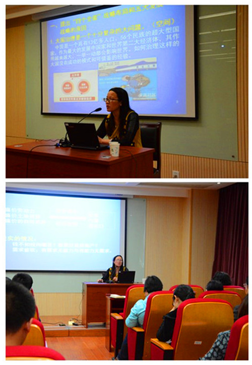 4月20日下午,马克思主义学院杜玉华教授应邀为社会发展学院、数学系、音乐学系、美术学系等单位的师生党员作了“从治国理政创造到决胜阶段新理念——‘四个全面’战略布局到十八届五中全会精神”的主题报告。 报告中,杜玉华教授从空间、时间、主体三大维度阐述了“四个全面”战略布局和“五大发展”理念提出的背景和原因,将“四个全面”战略布局和“五大发展”理念的由来、理解、定位以及意义简要作了说明。随后,又进一步地讲解了这两者的科学内涵。最后,杜老师为大家阐释了“四个全面”战略布局和“五大发展”理念之间的辩证关系。报告期间,杜玉华老师的独到见解、幽默风趣之语赢得师生们的喝彩。