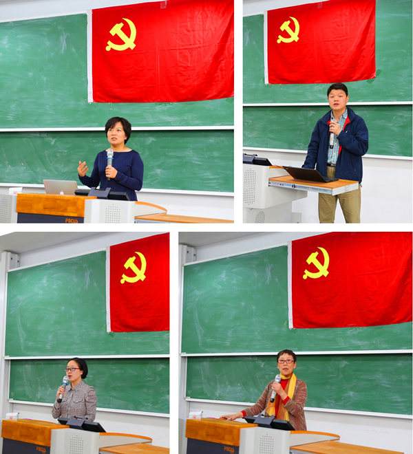 九个小组分别做调研汇报 在各小组汇报结束后,韩春红、杨光富、沈霄凤、柳叶四位老师分别进行了点评。韩春红老师结合近期党组织关系清理的案例,强调党校学习是为了让学员们真正了解党组织,认清自己的方向,希望学员们把此次调研作为一次自我反思的机会,在认识理解党的基础上慎重考虑入党问题。杨光富老师首先对调研形式、主题、内容、方式等作出了充分肯定。他表示,党校培训与调查研究相结合,关注入党积极分子的入党动机,注重团队合作,这样的形式非常好。调研中设计的情景模拟问题,如献血、对待个人利益与他人利益冲突等问题,与学生生活实际相关,具有很强的现实意义。同时,他也从研究方法的角度,分析了学员调研中的一些问题,对汇报成果进行了专业性的点评与指导。沈霄凤老师则根据调研反映出的问题,就共产主义信念的坚定性、对待荣誉的态度、奉献与慈善心等问题出发,建议党员再次深入理解、学习党章,努力拔高认识,提高认识问题和解决问题的能力。 报告会最后,柳叶老师作点评总结。她表示,调研成果汇报是一种学习的过程,建议学员们要把握好每一次互相学习的机会,加强学习的主动性,以“我主动、我负责”的态度,对待入党的整个过程,自觉争取入党。