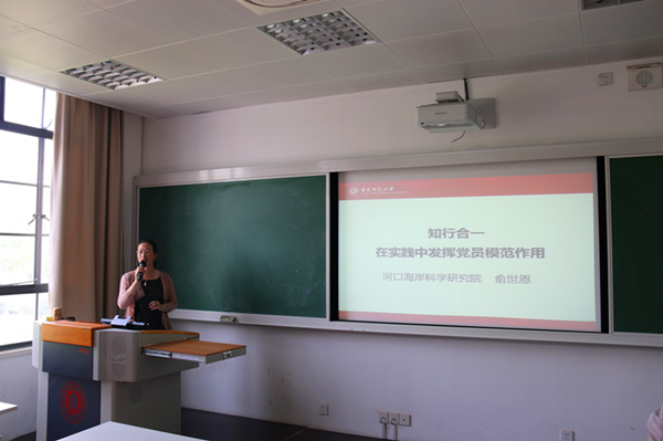 河口海岸科学研究院党委书记书记俞世恩作专题报告 课程中,俞老师针对90后学生的具体特点,结合丰富的案例,和学员们一起探讨了在当今国内外局势复杂多变、多元文化相互交融、社会价值观日趋多元、网络变革不断推进的情况下,学生党员该“做什么,怎么做”。她强调,作为党员和入党积极分子,应当以习近平总书记所提的“勤学、修德、明辨、笃实”来要求自己,从身边点滴事情做起,将个人成长与社会发展相结合,将能担大任与乐做小事相结合,在勤于践行中肩负起时代的使命,在知行合一中塑造自己的德行与品性,在追求进步的过程中,实现“成人—成长—成功”的转变。