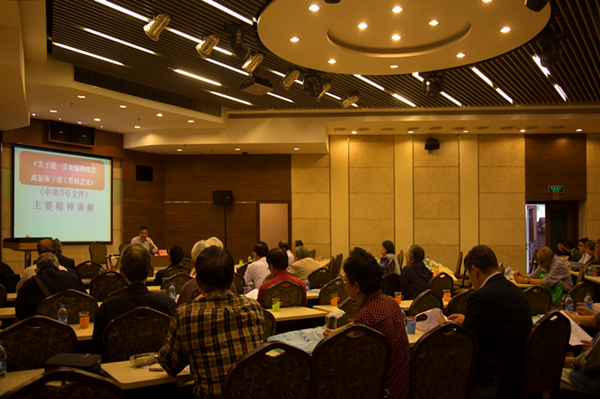 退休教职工党支部书记培训会现场 据了解,今年2月颁布的《关于进一步加强和改进离退休干部工作的意见》是自1982年2月《中共中央关于建立老干部退休制度的决定》后,又一个以中办、国办名义印发的老干部工作综合性文件,对新时期离退休干部工作以及退休教职工党建工作具有里程碑式的重要意义。文件号召离退休干部工作部门和老同志把为党和人民的事业增添正能量作为价值取向,发挥自身优势,积极开展以“展示阳光心态、体验美好生活、畅谈发展变化”为主要内容的为党和人民的事业增添正能量活动,践行社会主义核心价值观,弘扬中华民族传统美德,传递向上向善的精神力量,影响和带动周围群众坚定不移跟党走,共同释放正能量。会上,离退休党工委向各退休支部书记分发了市委老干部局组织编写的《上海市离退休干部党支部书记学习培训提纲》、上海市《《关于加强和改进机关事业单位离退休干部党建工作的若干意见》等学习参考资料。