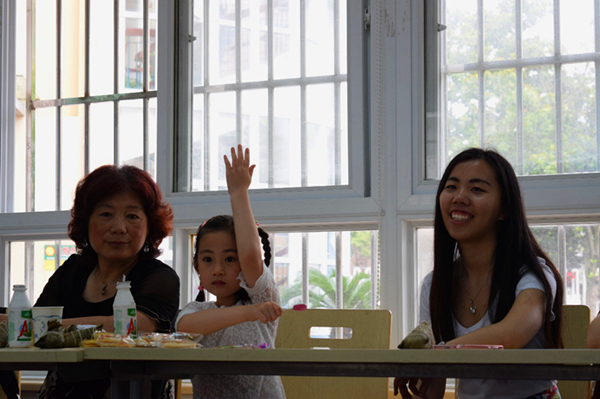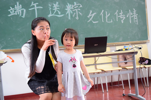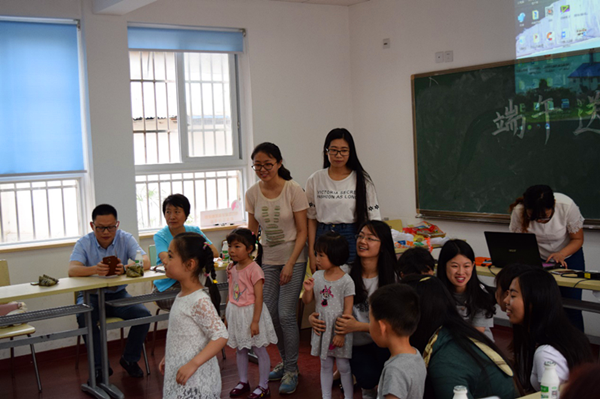 自我介绍进行时 端午节除了传递欢乐,承载着文化的知识自然也少不了。负责本次活动的栾金乐同学当起了小老师,配合着PPT、动画片和屈原的诗词,给孩子们讲起了端午节和粽子的故事。事实证明,文化的诱惑力比食物更大——孩子们纷纷放下了手中的粽子和零食,聚精会神地听着端午的传说和屈原的故事。“爱国”“志向”这些词汇尽管对于年幼的他们来说很抽象,但当它们化身为故事、诗词等有形之物后便会展现出独特的魅力。