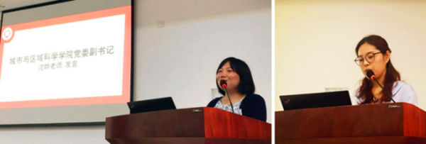党校优秀学员合影留念 党校优秀学员、优秀小组的表彰仪式过后,本期学生党校班主任、地理科学学院辅导员王纯老师发言,她希望大家“端正入党动机,坚定理想信念”,并用电视剧《伪装者》中明台及其家族为抗日战争胜利不惜牺牲个人生命和家族利益的案例,引导学员们在面对生活中各种诱惑时要坚定信念,执着于自己的理想,全心全意为人民服务。城市与区域科学学院党委副书记沈晔老师则表示学员们对“优秀”要有自己的评价体系。她说,优秀是一种选择、一种习惯,需要历练。希望大家走出课堂后依旧能不断开拓视野,坚持信念,勇于担当,主动作为。