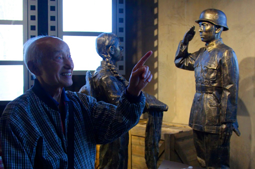 路群同志讲述杨惠敏献旗的故事 老同志们不顾年高体弱,都坚持看完分布在纪念馆两层的六个展区。九十高龄的抗战老军人路群走在队伍前头,不时介绍他了解的那个时期的一些史实。各展区陈列的模型、实物和文字资料,让老同志们重温了那段苦难而悲壮的历史。