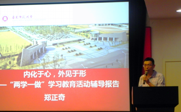 学生代表黄婷同志发言 随后,学院党委书记郑正奇同志作“内化于心,外见于行——‘两学一做’”学习教育辅导报告,重点讲述了作为一名党员应该做什么、怎么做,如何把“两学一做”落到实处。并指出学院将从“理论素养提升”和“党员承诺实践”等方面开展“两学一做”学习教育活动,强调党员同志要学党章、学党纪党规、学系列讲话。