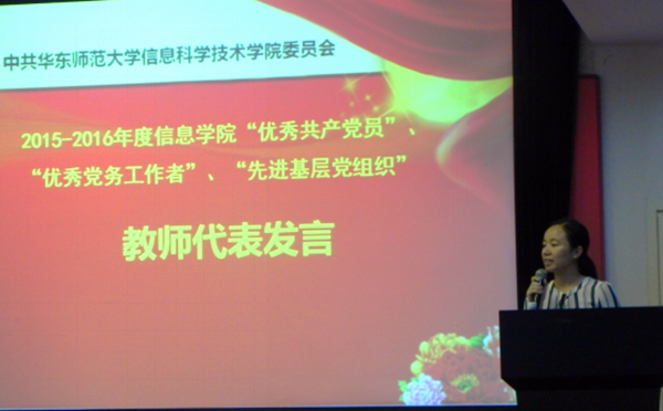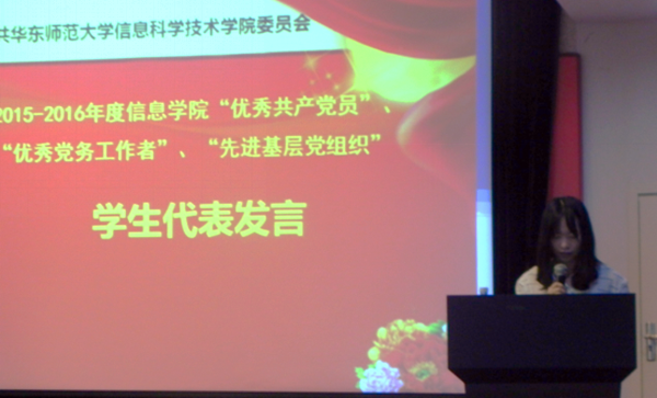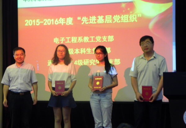 信息学院“先进基层党组织”:电子系教工党支部、2013级本科生党支部、通信系2014级研究生党支部 周梅同志和黄婷同志分别作为教师代表、学生代表进行发言,阐述如何在日常学习、科研、工作中提升党性修养,践行“两学一做”精神,并表示将以优秀共产党员的标准严格要求自己,为人民服务。