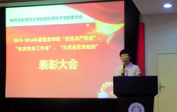 全体师生党员起立,奏唱国歌 会上,学院党委书记郑正奇宣读了《中共信息科学技术学院委员会关于表彰“优秀共产党员”、“优秀党务工作者”、“先进基层党组织”的决定》,经各支部民主推荐,经学院党委会审查,决定授予李庆利等10名同志信息学院“优秀共产党员”荣誉称号;授予蔡小梅等3名同志信息学院“优秀党务工作者”荣誉称号;授予电子系教工党支部等3个党支部信息学院“先进基层党组织”荣誉称号。由郑正奇同志和杨平雄同志对受到表彰的先进党支部和优秀个人进行颁奖。